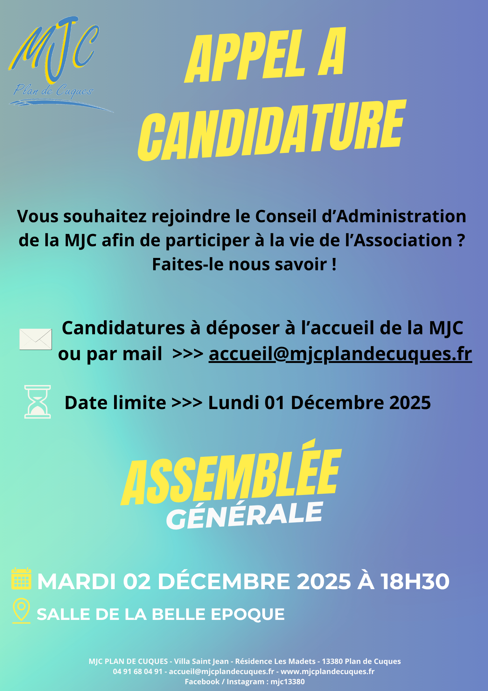 ACTIVITÉS : 04 91 68 04 91 - accueil@mjcplandecuques.fr