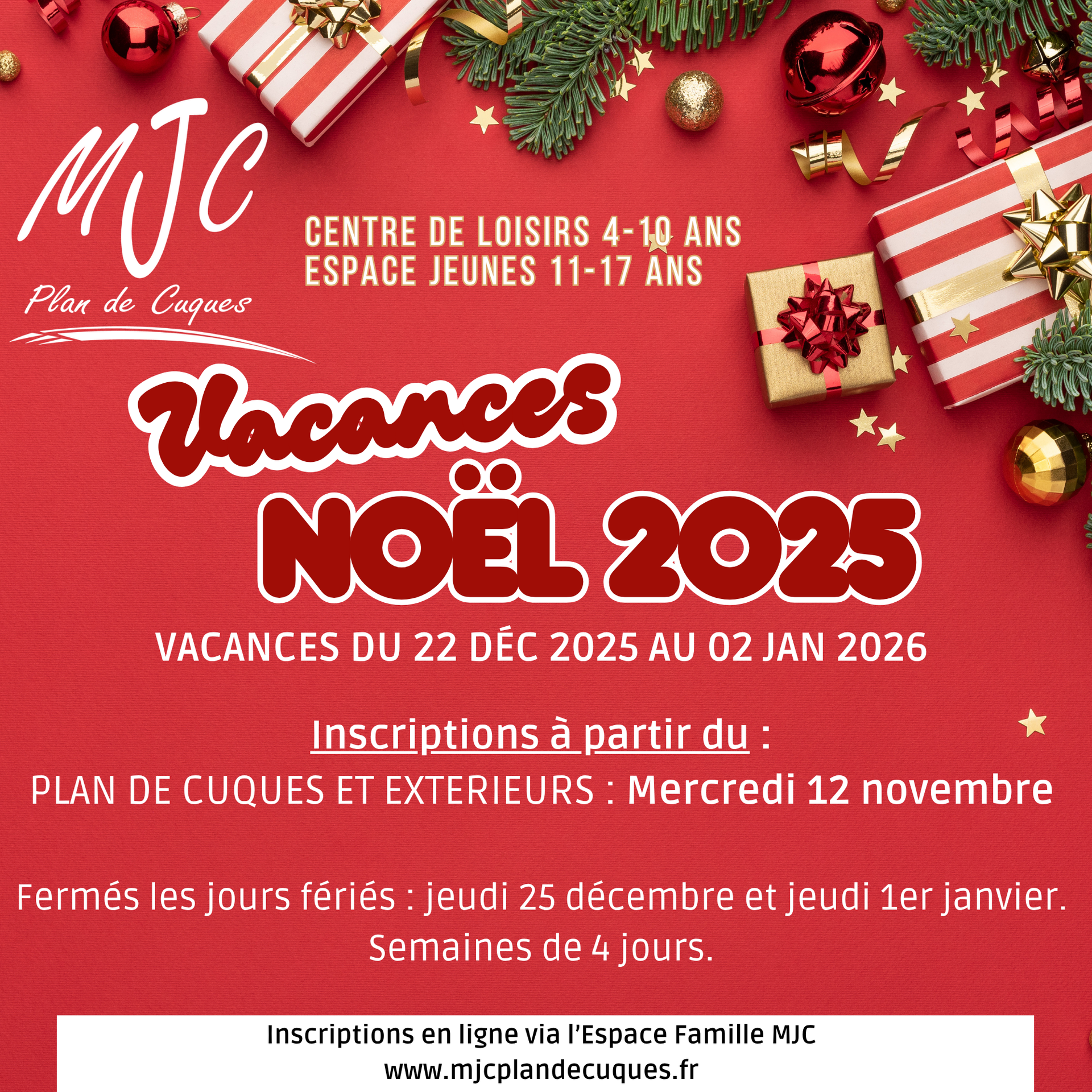 Les 2 structures seront ouvertes du lundi 22 décembre 2025 au vendredi 02 janvier 2026.