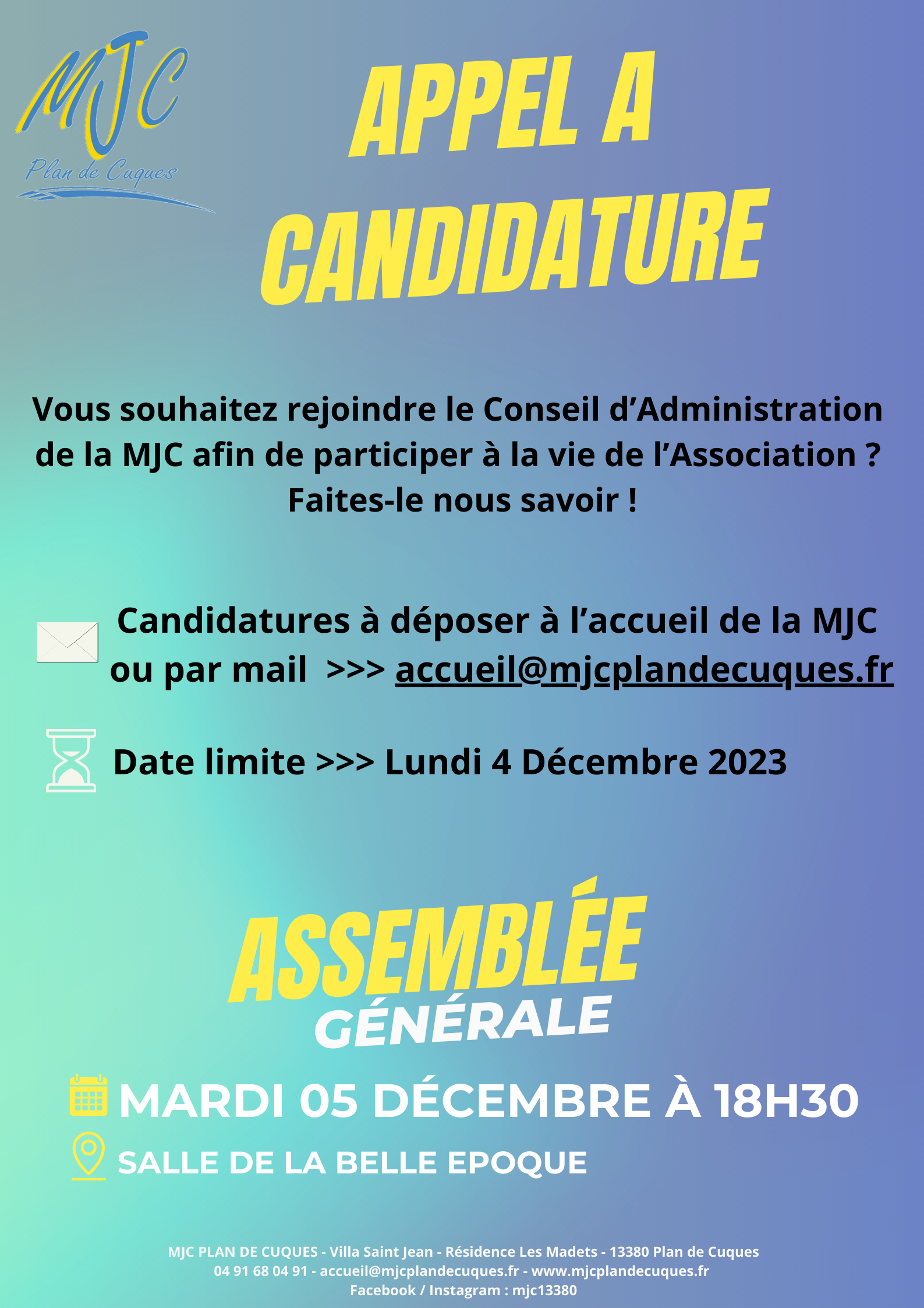 ACTIVITÉS : 04 91 68 04 91 - accueil@mjcplandecuques.fr